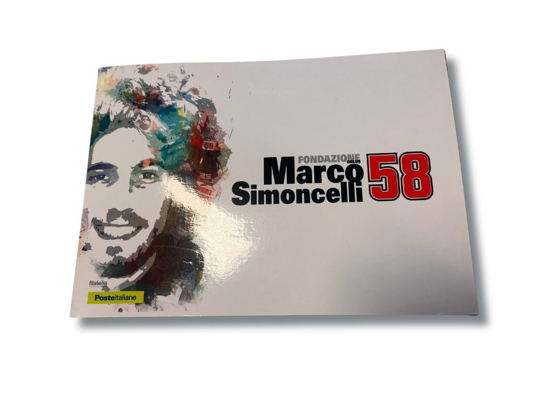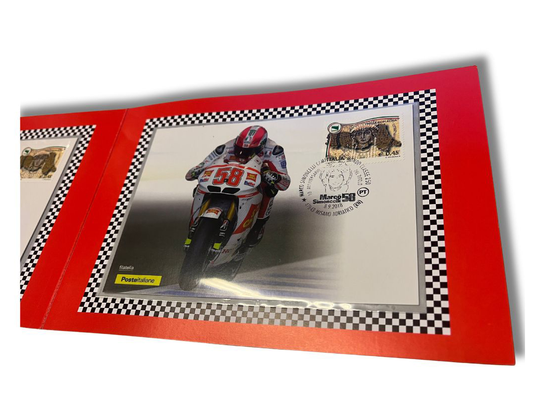Folder filatelico – Un oggetto da collezione unico per veri appassionati: un folder filatelico dedicato a Marco Simoncelli, realizzato in tiratura limitata numerata per commemorare i 10 anni dalla sua vittoria nel campionato del mondo. Questo folder non è un semplice ricordo: è un pezzo da collezione pensato per gli amanti della filatelia e della storia delle due ruote. Contiene francobolli e annulli postali speciali, presentati in confezione curata e numerata.